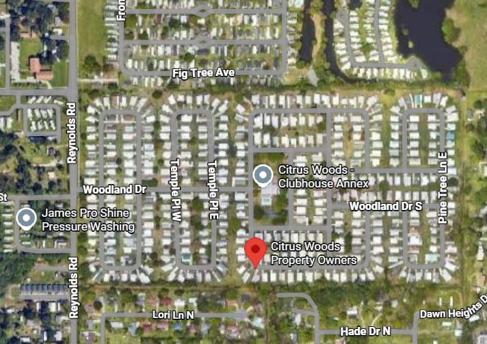 Citrus Woods Estates are a 55+ retirement mobile home community with 385 homes and individually owned land in a park like setting, including a resident owned Clubhouse, swimming pool, annex, shuffleboard courts, and a pool room. They are volunteered based and operated with elected officers and a board of directors.